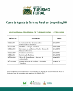 O Sistema Faemg/Senar Minas, através do Sindicato Rural de Leopoldina, em parceria com a IGR Serras e Cachoeiras e a Secretaria de Cultura e Turismo de Leopoldina abre inscrições para Programa de Agente de Turismo Rural para iniciar a partir de 13 de abril.
