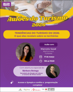 Na próxima terça-feira, 17/03, acontece o Aulão “Tendências do Turismo em 2026: O que elas revelam sobre os territórios”, com a especialista Marcela Saad (WeConnect Turismo) e abertura especial da Secretária de Estado de Cultura e Turismo, Bárbara Botega.